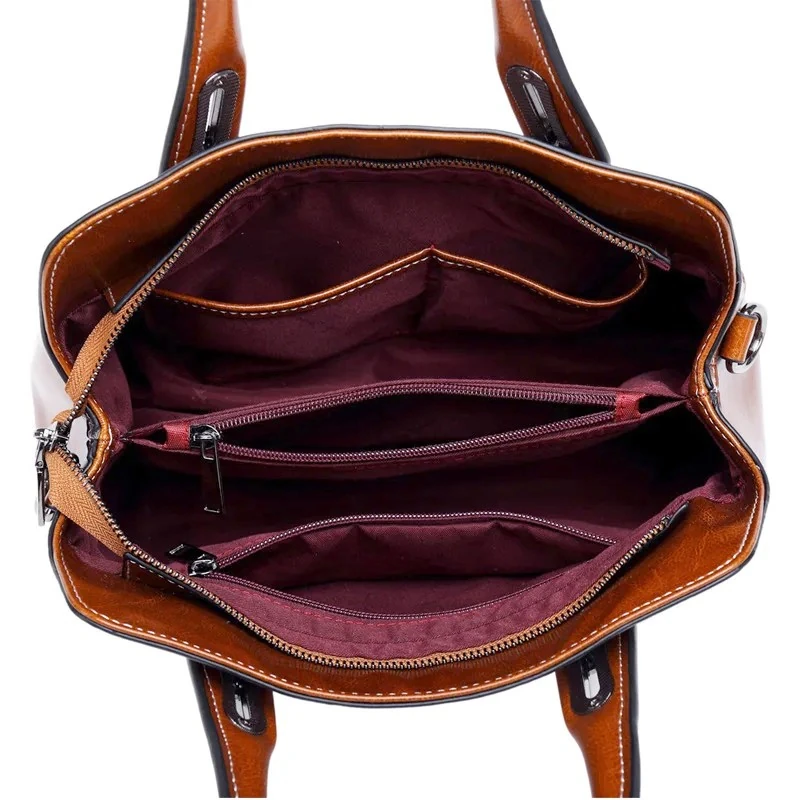 Insida av brun handväska, rymliga fack och dragkedjor för praktisk organisering.