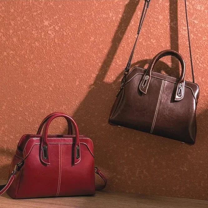 Kollektion av väskor i läder: brun, svart, röd och mörkbrun, med kontrastsömmar och elegant look.
